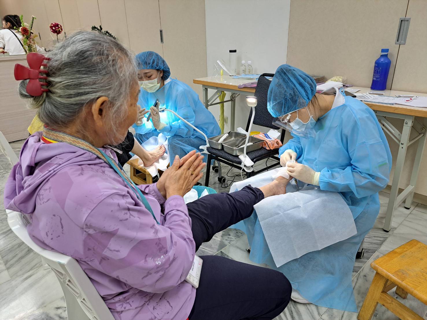 活動現場有中西醫義診,中華安親手護健康公益會並有多位傳統整復師傅為長輩整療。尤其醫甲館專業人員為長輩修剪腳趾甲甚至灰指甲治療,如宗法師說許多長輩年紀大了,彎不下腰,無力剪腳趾,因此特別請專業人員協助,多位長輩在剪完腳趾頭後相當開心。
